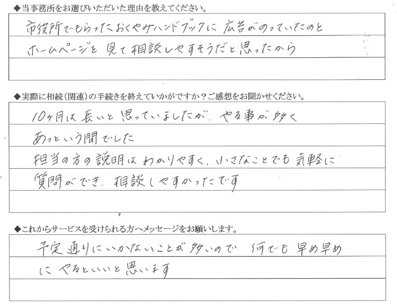 - 長野市役所でもらった相続についてのパンフレットの広告を見てお願いしました。相続手続きは手間がかかるので先送りにせず、なるべく早く進めた方が良いです。