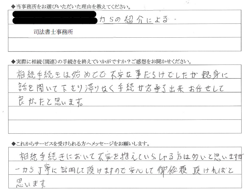 相続手続きは初めてで不安な事だらけでしたが、親身に話を聞いて下さり滞りなく手続が完了出来お任せして良かったと思います。