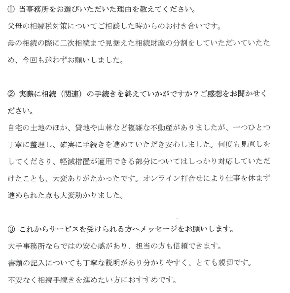 自宅の土地のほか、貸地や山林など複雑な不動産がありましたが、一つひとつ丁寧に整理し、確実に手続きを進めていただき安心しました。