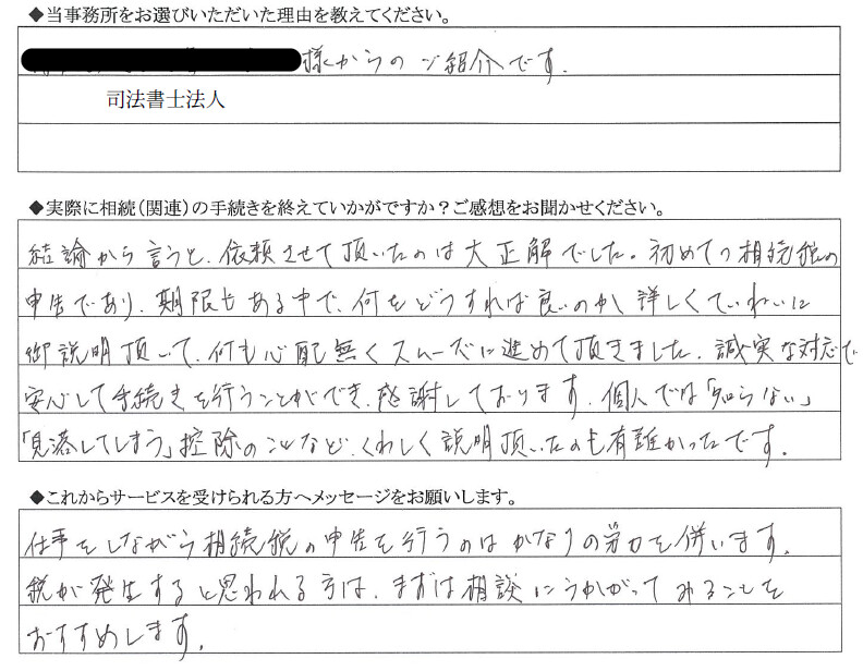 初めての相続税の申告であり、期限もある中で、何をどうすれば良いのか詳しくていねいに御説明頂いて、何も心配無くスムーズに進めて頂きました。
