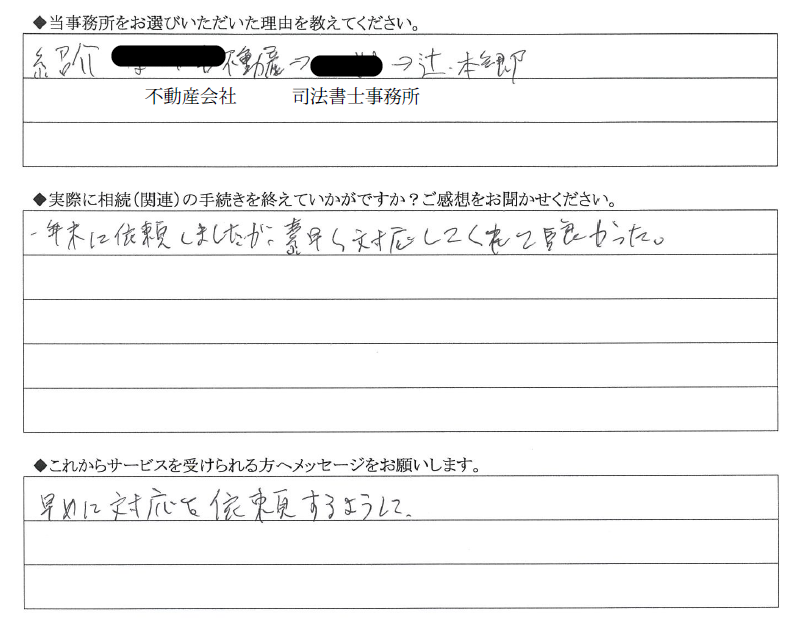 - 相続開始後、不動産の書類を取りに市役所へ行った際に、窓口に置いてあった冊子を見てお願いしました。 自分で申告を行おうと本やネットで調べていましたが、合っているのか? という不安は無くならず、結果、…