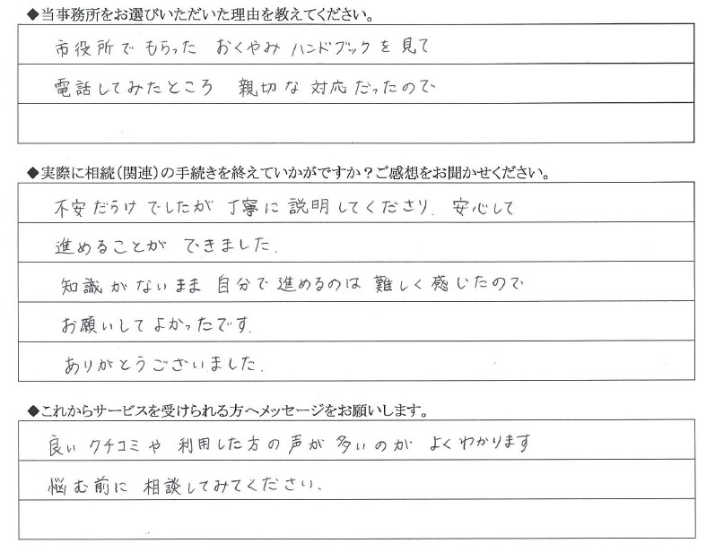 市役所でもらったおくやみハンドブックを見て電話してみたところ、親切な対応だったので。
